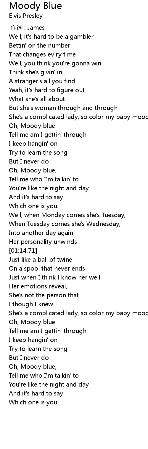| [00:28.47] | She's a complicated lady, so color my baby moody blue, |