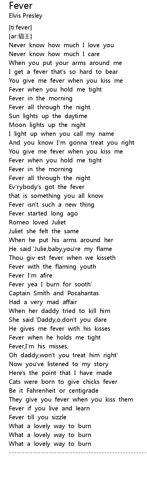 | [00:54.304] | You give me fever when you kiss me |