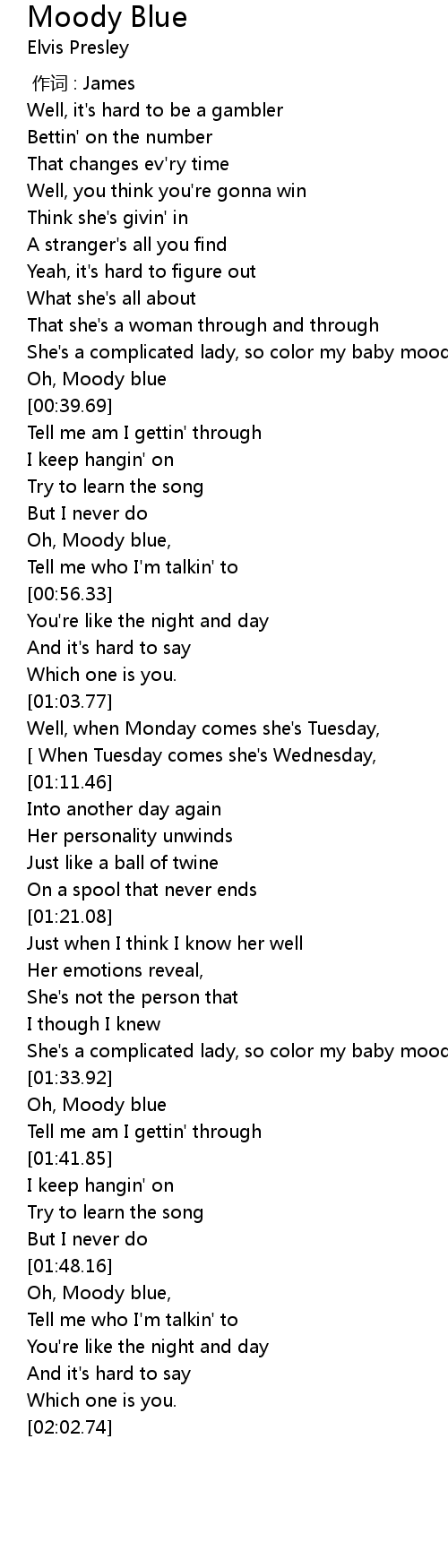 | [00:30.34] | She's a complicated lady, so color my baby moody blue, |