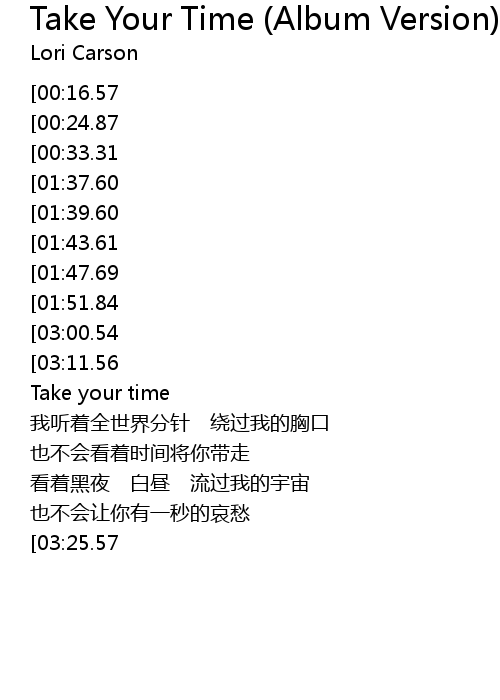 | [03:19.66][03:11.56][03:03.08][01:56.88][00:58.50] | Take your time Take you time Take your time |