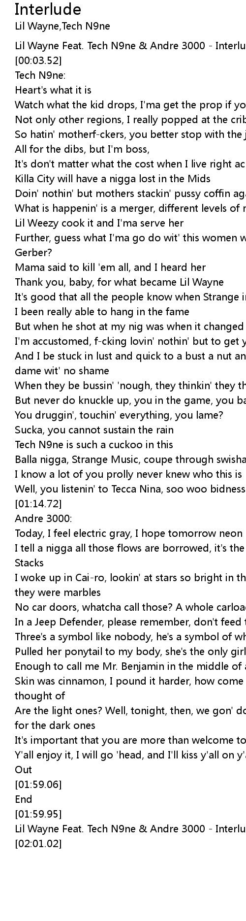 | [00:00.02] | Lil Wayne Feat. Tech N9ne & Andre 3000 - Interlude |