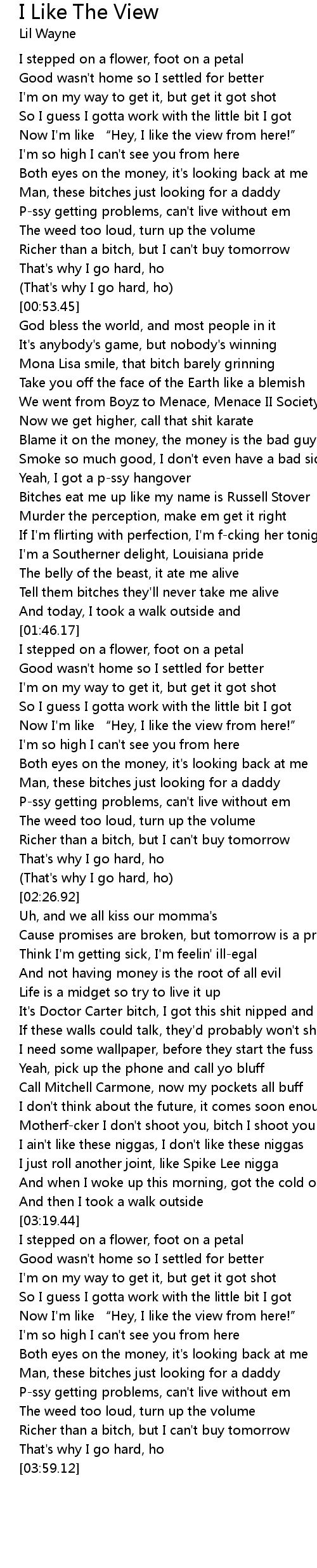 | [00:40.31] | Pssy getting problems, can' t live without em |