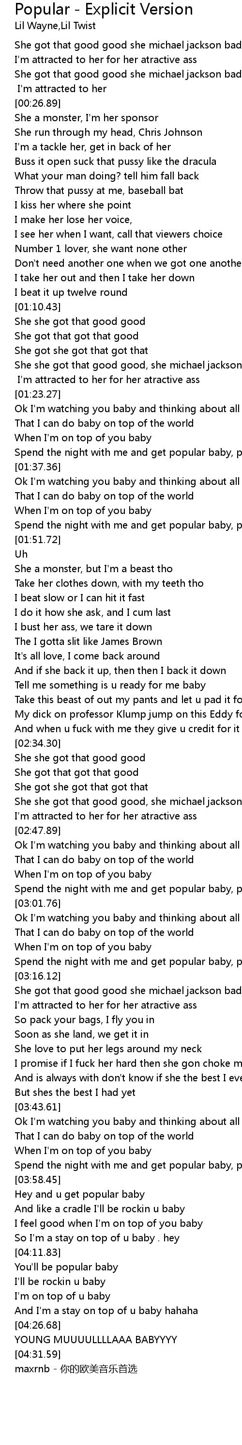 | [02:57.04] | Spend the night with me and get popular baby, popopular baby |
