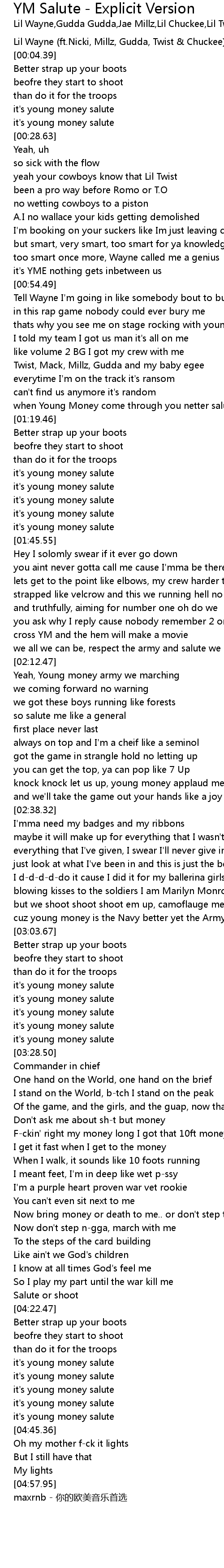 | [00:03.32] | Lil Wayne ft. Nicki, Millz, Gudda, Twist Chuckee YM Salute |