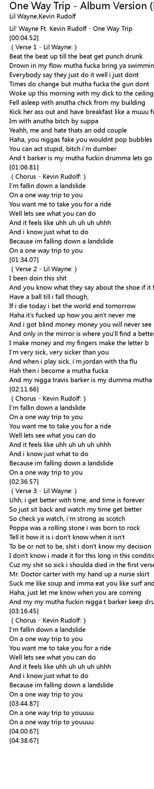 | [00:00.52] | Lil' Wayne Ft. Kevin Rudolf One Way Trip |