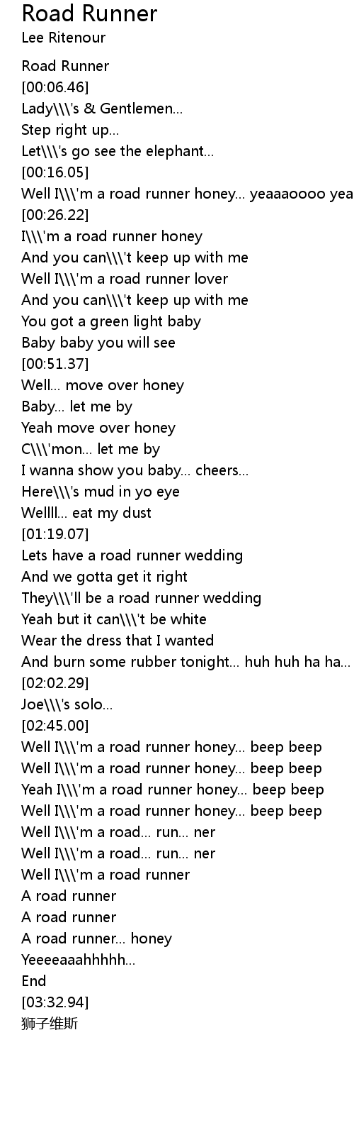 | [02:58.88] | Well I\\\'m a road runner honey... beep beep |