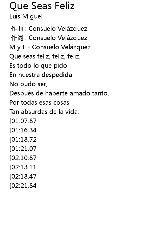 | [02:40.56][02:21.84][01:37.78] | Quiero que seas feliz, feliz, feliz |