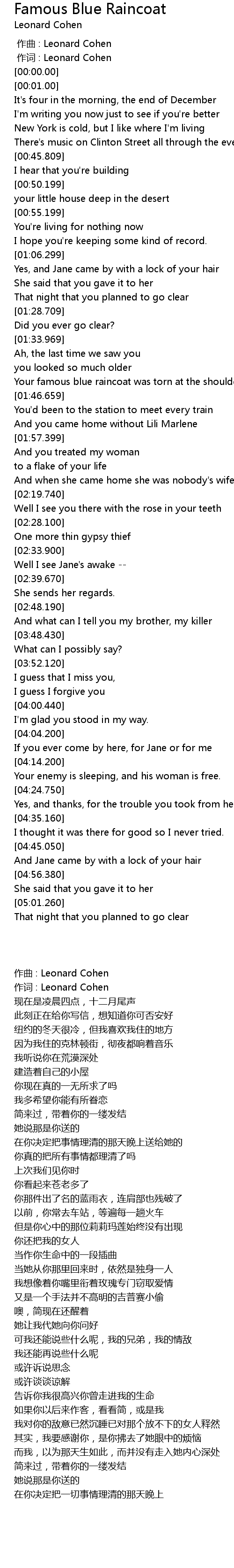 | [01:42.219] | Your famous blue raincoat was torn at the shoulder |