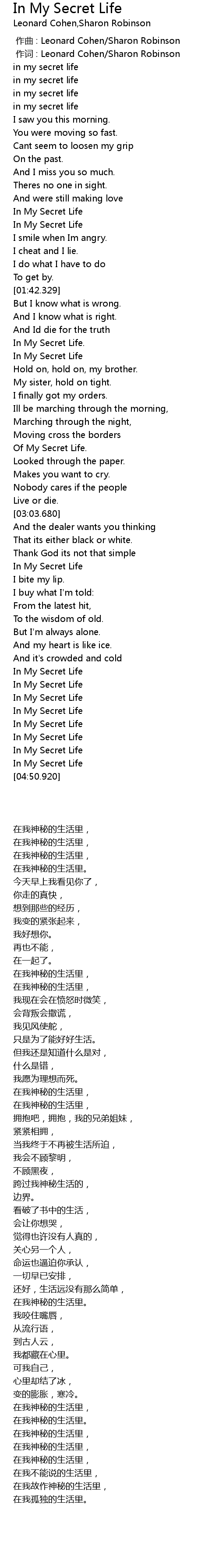 | [00:00.926] | 作词 : Leonard Cohen/Sharon Robinson |