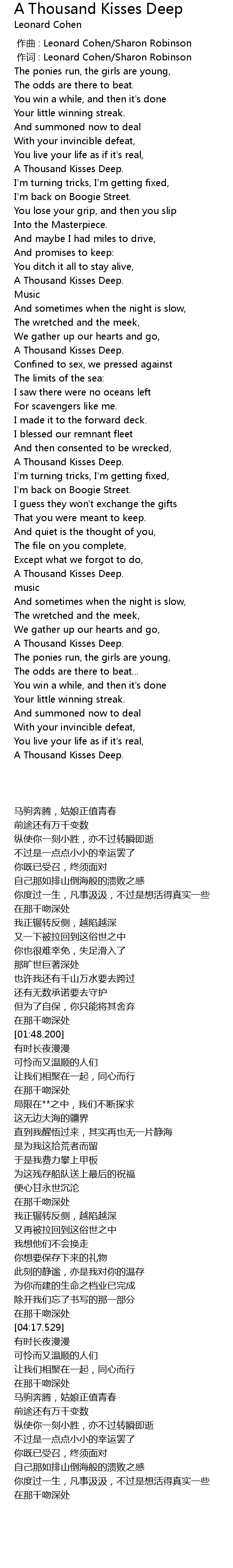 | [00:01.00] | 作词 : Leonard Cohen/Sharon Robinson |