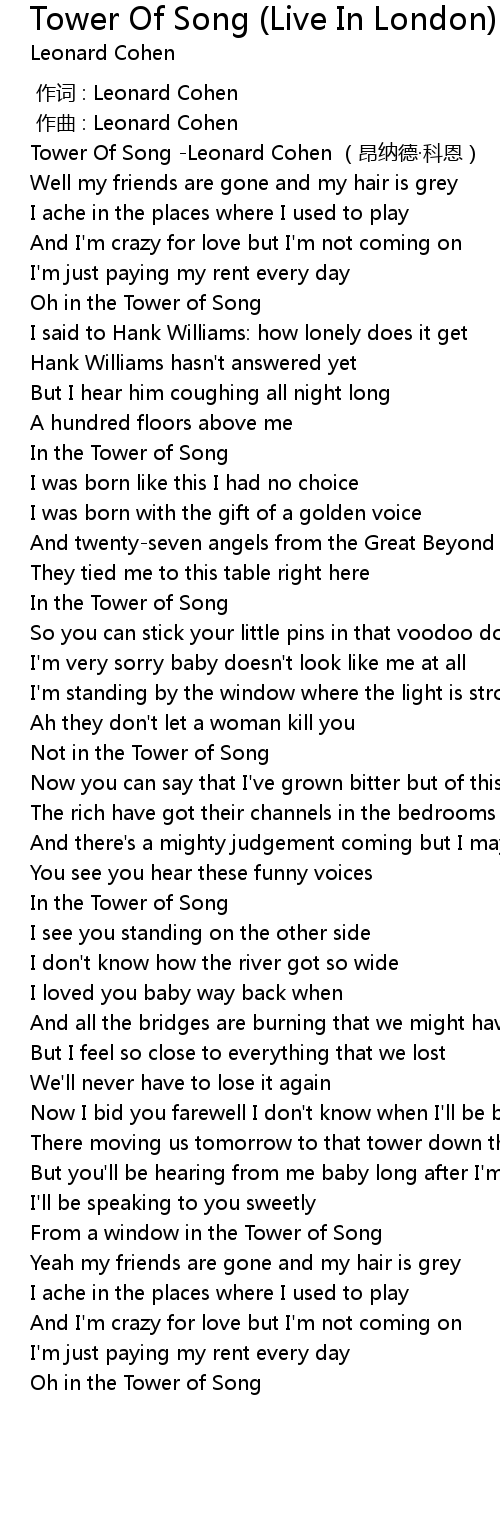 | [00:00.00] | Tower Of Song -Leonard Cohen (昂纳德·科恩) |
