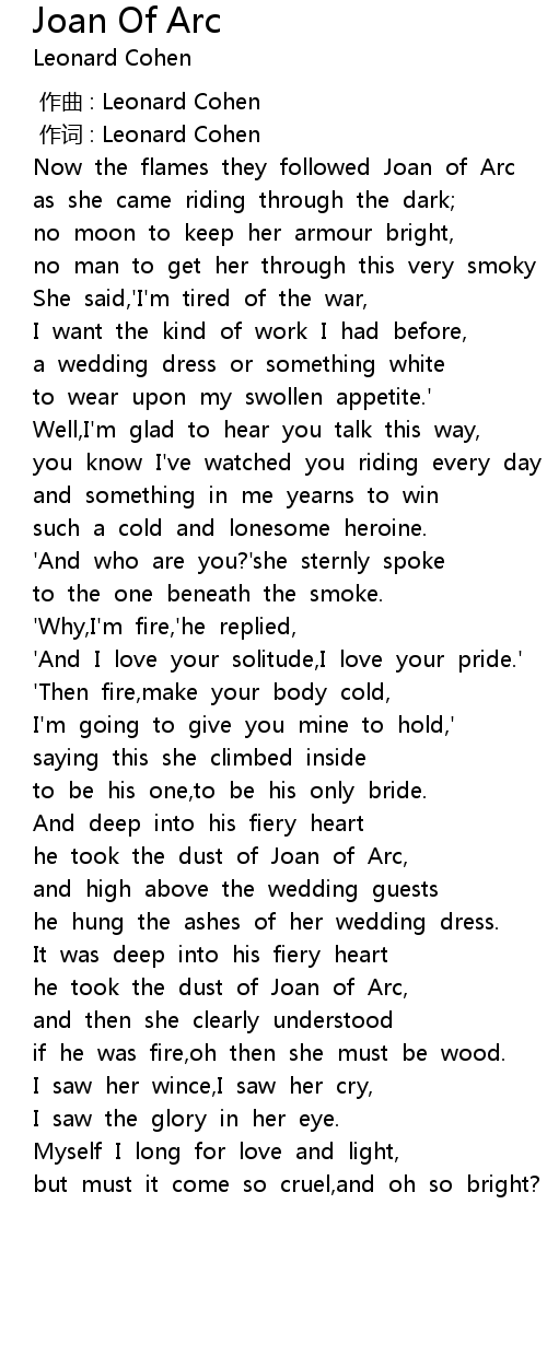 | [00:29.31] | Now the flames they followed Joan of Arc |