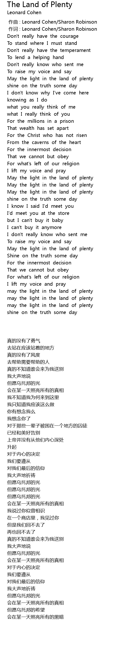 | [00:01.00] | 作词 : Leonard Cohen/Sharon Robinson |