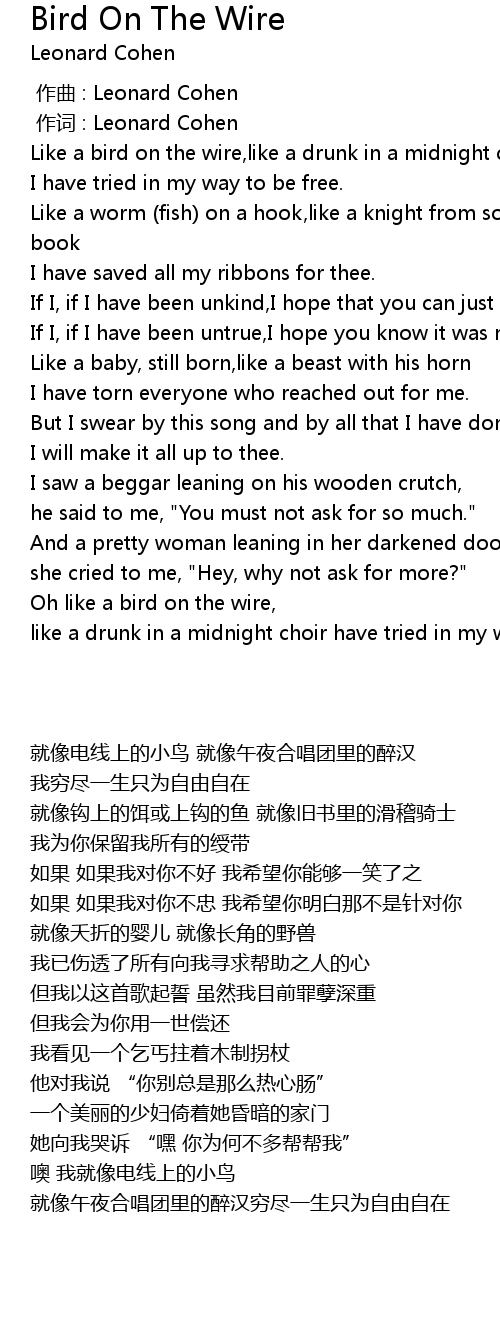 | [00:03.299] | Like a bird on the wire, like a drunk in a midnight choir |