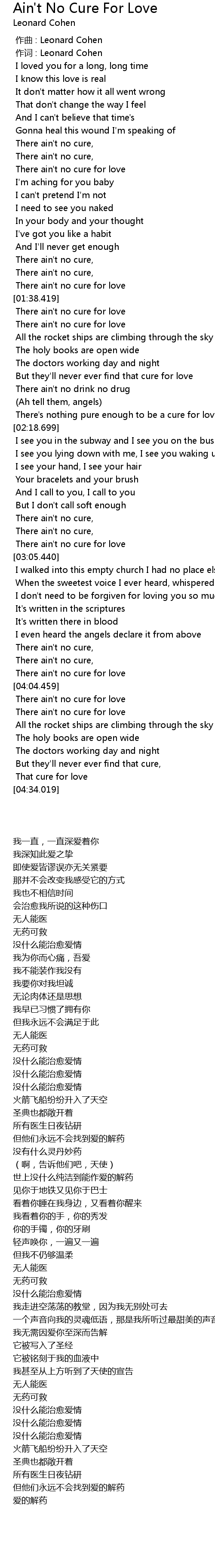 | [01:44.690] | There ain' t no cure for love |