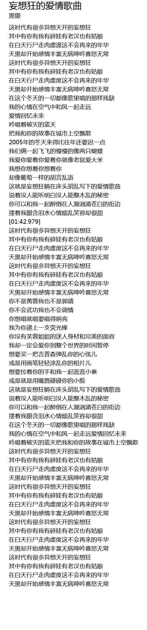 | [01:13.400] | zhè jiù shì wàng xiǎng kuáng tǎng zài chuáng tóu hú luàn xiě xià de ài qíng gē qǔ |