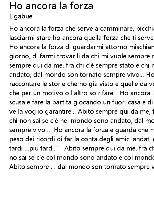| Ho ancora la forza che serve a camminare, picchiare ancora contro per non lasciarmi stare ho ancora quella forza che ti serve quando dici: " Si comincia!" Ho ancora la forza di guardarmi attorno mischiando le parole con 2 o 3 vizi al giorno, di farmi trovar lì da chi mi vuole sempre nella mia camicia... Abito sempre qui da me, fra chi c'è sempre stato e chi non sai se c'è al mondo sono andato, dal mondo son tornato sempre vivo... Ho ancora la forza di starvi a raccontare le storie che ho già visto e quelle da vedere, e tutti quegli sbagli che per un motivo o l' altro so rifare... Ho ancora la forza di chiedere anche scusa e fare la partita giocando un fuori casa e dirvi che comunque la mia parte ve la voglio garantire... Abito sempre qui da me, fra chi c'è sempre stato e chi non sai se c'è nel mondo sono andato, dal mondo son tornato sempre vivo... sempre vivo Ho ancora la forza e guarda che ne serve per rendere leggero il peso dei ricordi di far la conta degli amici andati e dire: " Ci vediam più tardi ... più tardi.." Abito sempre qui da me, fra chi c'è sempre stato e chi no sai se c'è col mondo sono andato e col mondo son tornato sempre vivo... Abito sempre dal mondo son tornato sempre vivo. |