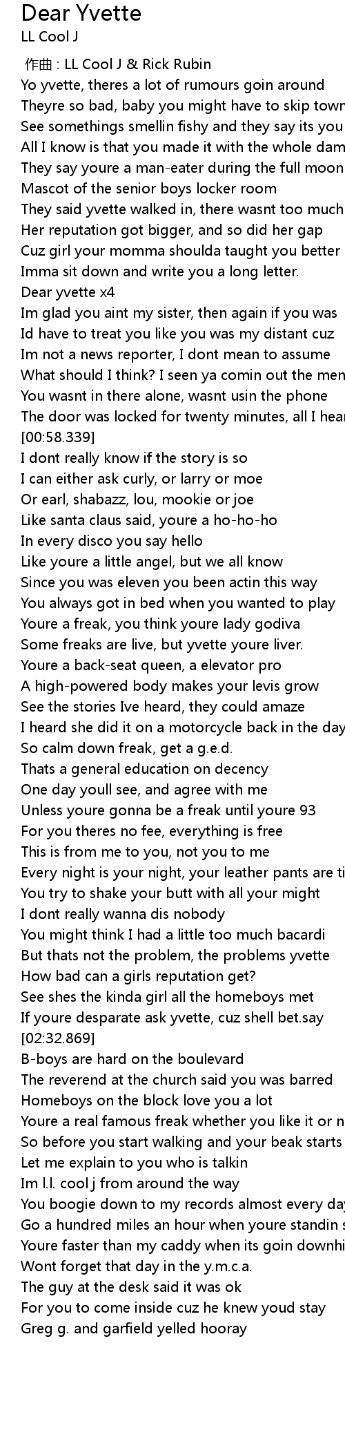 | [00:03.519] | Yo yvette, theres a lot of rumours goin around |