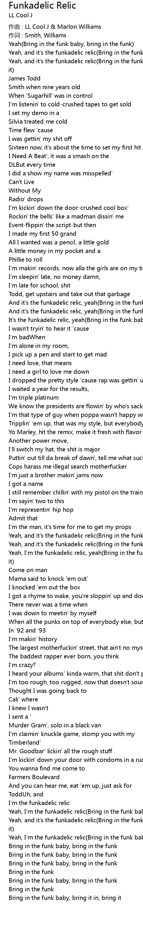 | Yeah, I' m the funkadelic relic, yeah Bring in the funk baby, bring it in, bring it | |