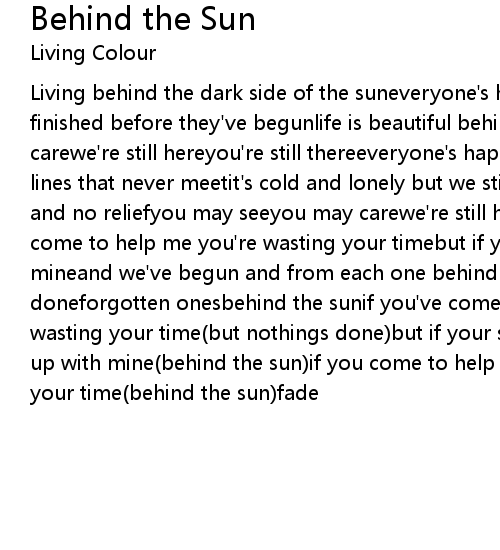 Living behind the dark side of the suneveryone's here but nobody comesthings are finished before they've begunlife is beautiful behind the sunyou may seeyou may carewe're still hereyou're still thereeveryone's happy life is sweetparallel lines that never meetit's cold and lonely but we still believethe waters rise and no reliefyou may seeyou may carewe're still hereyou're still thereif you come to help me you're wasting your timebut if your struggle is bound up with mineand we've begun and from each one behind the sunpromises madebut nothings doneforgotten onesbehind the sunif you've come to help me(promises made)you're wasting your time(but nothings done)but if your struggle(forgotten ones)is bound up with mine(behind the sun)if you come to help me(behind the sun)you're wasting your time(behind the sun)fade |