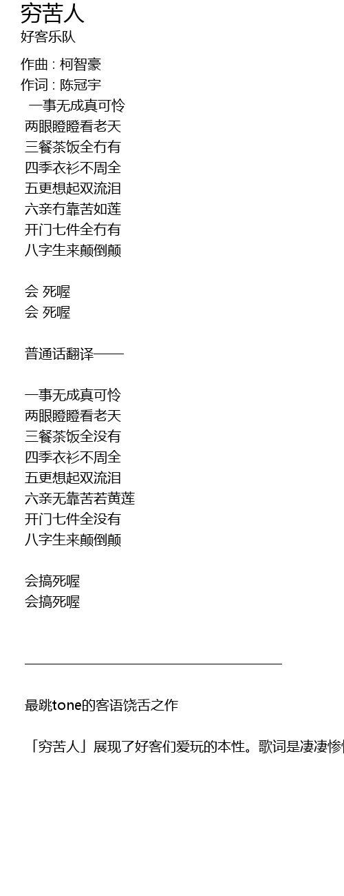 | 「穷苦人」展现了好客们爱玩的本性。歌词是凄凄惨惨,乐曲是嘻皮笑脸,两相对照下拉扯出音乐的张力,更显好客的独到幽默!唢吶、电吉他、二胡等乐器高声狂飙,互不相让,重现客家山歌早期属于山林天地的野味!还有,将客家本有的虚字念唱,放进新编的饶舌曲中一点都不突兀,好客在时间与空间的音乐坐标中,找到了恰到好处的位子! |