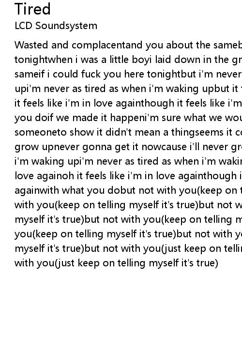 Wasted and complacentand you about the samebut still i want to get iton with you tonightwhen i was a little boyi laid down in the grassi'm sure you'd feel the sameif i could fuck you here tonightbut i'm never as tired as when i'm waking upi'm never as tired as when i'm waking upbut it feels like i'm in love againoh it feels like i'm in love againthough it feels like i'm in love againwith what you doif we made it happeni'm sure what we would dorun outside and fuck someoneto show it didn't mean a thingseems it could be simpleif i could just grow upnever gonna get it nowcause i'll never growbut i'm never as tired as when i'm waking upi'm never as tired as when i'm waking upbut it feels like i'm in love againoh it feels like i'm in love againthough it feels like i'm in love againwith what you dobut not with you(keep on telling myself it's true)but not with you(keep on telling myself it's true)but not with you(keep on telling myself it's true)but not with you(keep on telling myself it's true)but not with you(keep on telling myself it's true)but not with you(just keep on telling myself it's true)but not with you(just keep on telling myself it's true)but not with you(just keep on telling myself it's true) |