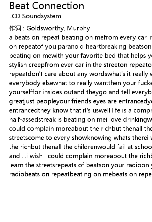 | a beats on repeat beating on mefrom every car in the streetit's constant repeat on repeatof you paranoid heartbreaking beatson repeatit's a fine song on repeat beating on mewith your favorite bed that helps you sleepand hear comes the news stylish creepfrom ever car in the streeton repeaton repeatuh huhuh ohoh yeahon repeatdon't care about any wordswhat's it really worthbecause they can tell everybody elsewhat to really wantthen your fucked soact like it's for yourselffor insides outand theygo and tell everybody elsethat we're really greatjust peopleyour friends eyes are entrancedyour friends eyes are entrancedthey know that it's uswell life is a compromisebut your beats are half-assedstreak is beating on mei love drinkingweed is helping me sleepi wish i could complain moreabout the richbut thenall the childrenwould learn the streetscome to every showknowing whats therei wish i could complain moreabout the richbut thenall the childrenwould fail at schoolcome to every showdrugged and ...i wish i could complain moreabout the richbut thenall the childrenwould learn the streetsrepeats of beatson your radioon your radioon your radioon your radiobeats on repeatbeating on mebeats on repeatbeating on me |