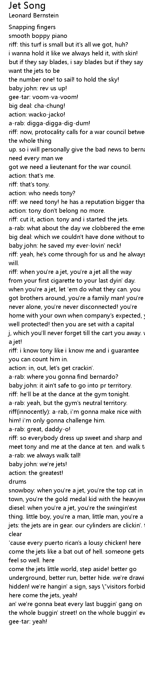 underground, better run, better hide. we're drawin' the line, so keep your noses hidden! we're hangin' a sign, says \"visitors forbidden\" and we ain't kiddin'! here come the jets, yeah! |