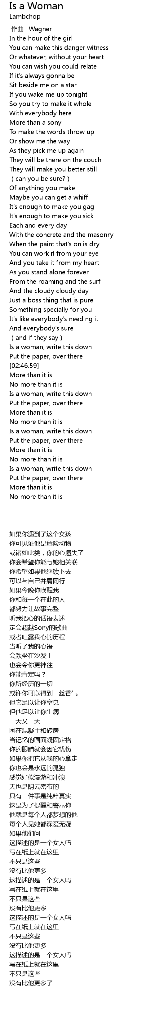 | [02:33.61] | Is a woman, write this down |