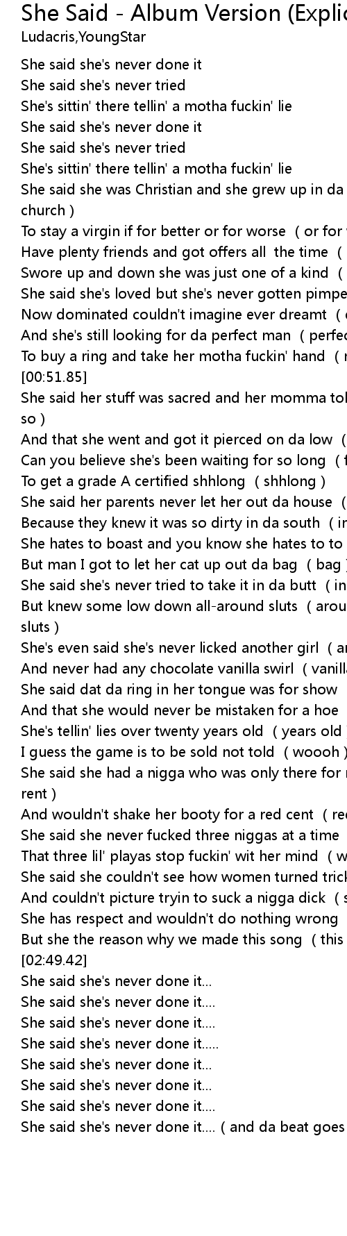 | [01:43.45] | She said she' s never tried to take it in da butt in da butt |