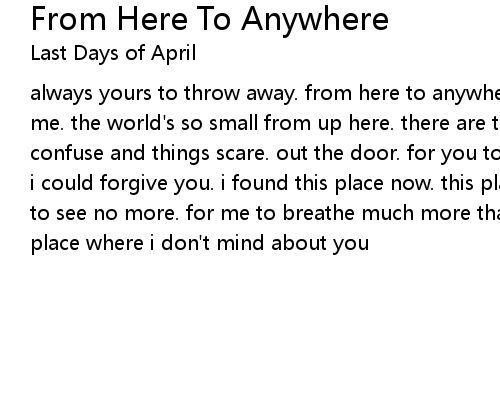 | always yours to throw away. from here to anywhere. will you be there to catch me. the world's so small from up here. there are things you held from me. things confuse and things scare. out the door. for you to see no more. i never thought i could forgive you. i found this place now. this place where i'm fine. for you to see no more. for me to breathe much more than air. a place where i am fine. a place where i don't mind about you |