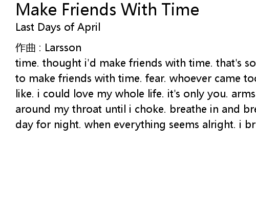 | time. thought i' d make friends with time. that' s something that i would' t mind. to make friends with time. fear. whoever came too near. whoever made me feel like. i could love my whole life. it' s only you. arms. how i hate autumn arms. around my throat until i choke. breathe in and breathe out. night. when i trade day for night. when everything seems alright. i break through thin ice |