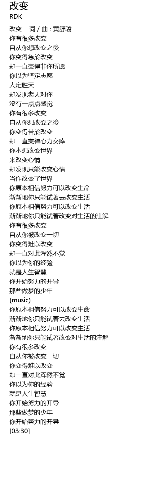 | [00:00] | 改变 词/曲∶黄舒骏 |