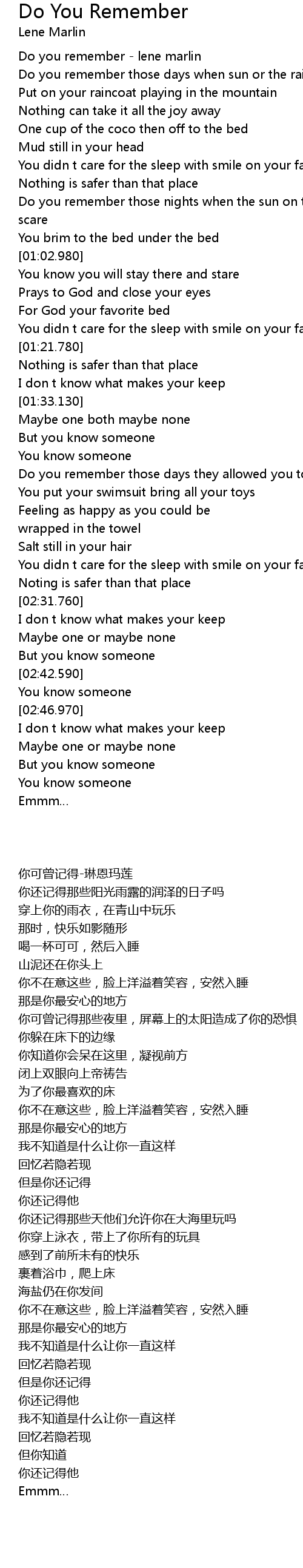 | [00:51.150] | Do you remember those nights when the sun on the screen made your scare |
