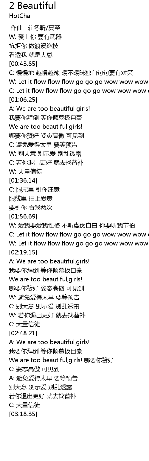 | [02:55.45] | We are too beautiful, girls! nǎ yào nǐ zàn hǎo |