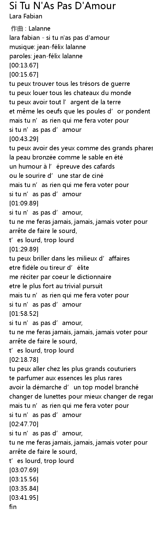 | [00:00.00] | lara fabian si tu n' as pas d' amour |