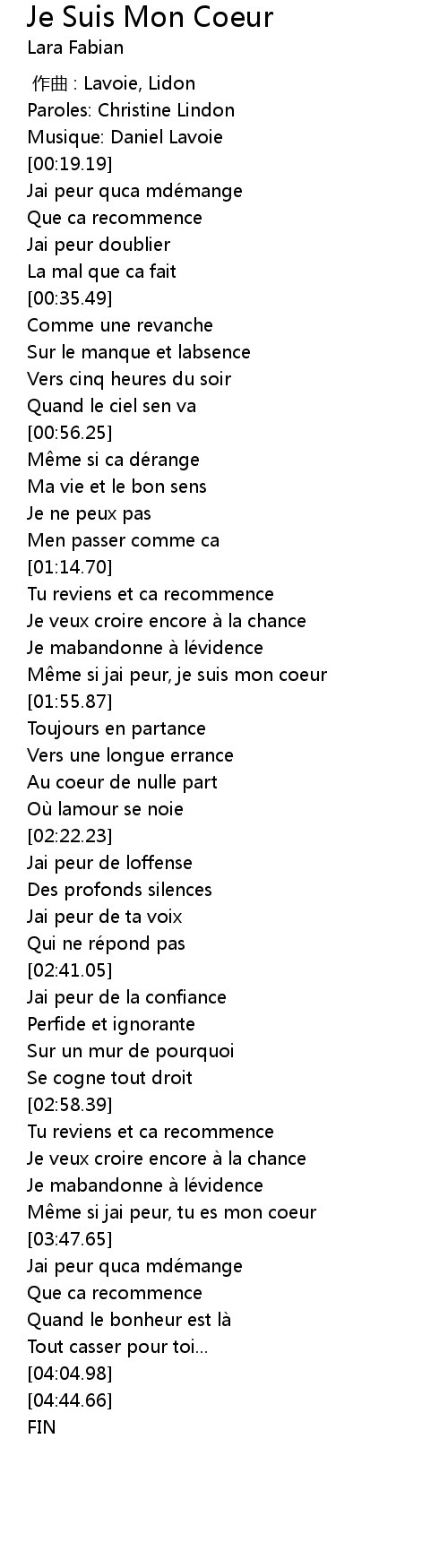| [01:37.92] | M me si jai peur, je suis mon coeur |