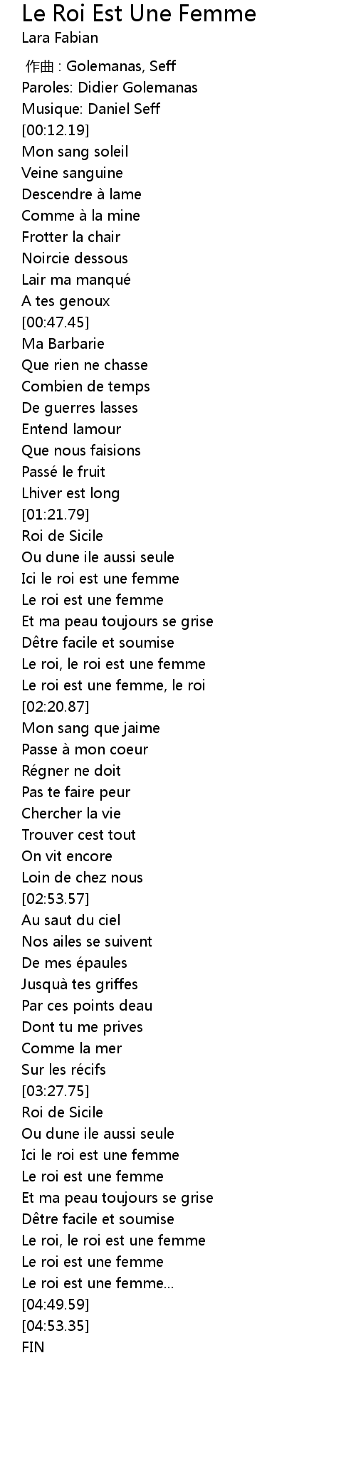 | [04:14.99] | Le roi est une femme |