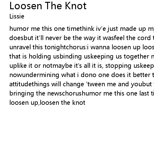 humor me this one timethink iv'e just made up my mindlooking at me like a lover doesbut it'll never be the way it wasfeel the cord that holds us tightlets unravel this tonightchorus:i wanna loosen up loosen uploosen the knotthe knot that is holding usbinding uskeeping us together nowi'm gonna give it up, toughen uplike it or notmaybe it's all it is, stopping uskeeping us together nowundermining what i dono one does it better than youwhen you change your attitudethings will change 'tween me and youbut the end is comin' darlingand i'm bringing the newschorushumor me this one last timechorusi wanna loosen up, loosen up,loosen the knot |