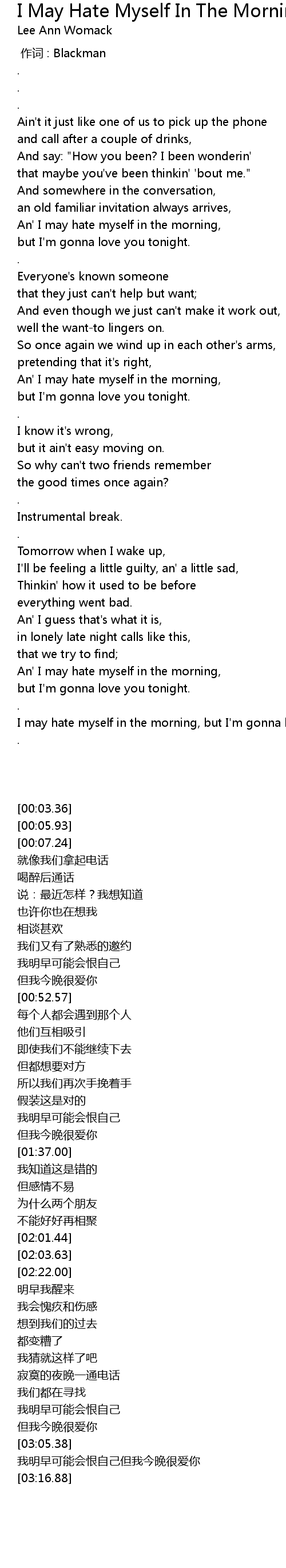 | [03:08.13] | I may hate myself in the morning, but I'm gonna love you tonight |