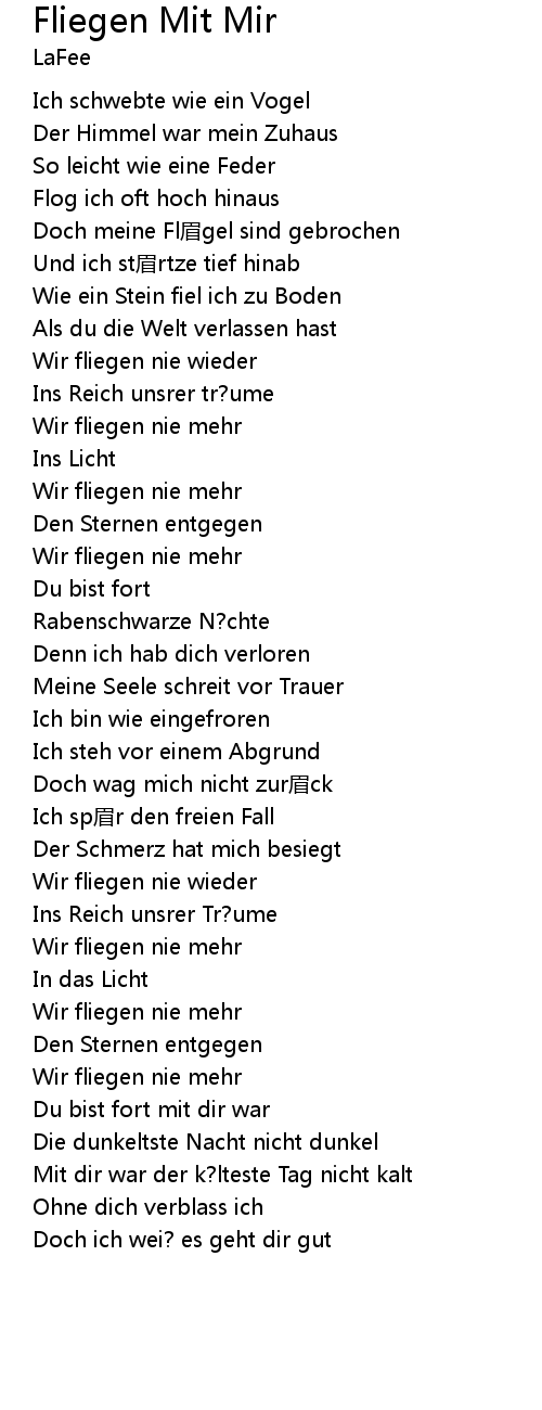 | [00:25.87] | Doch meine Fl mei gel sind gebrochen |