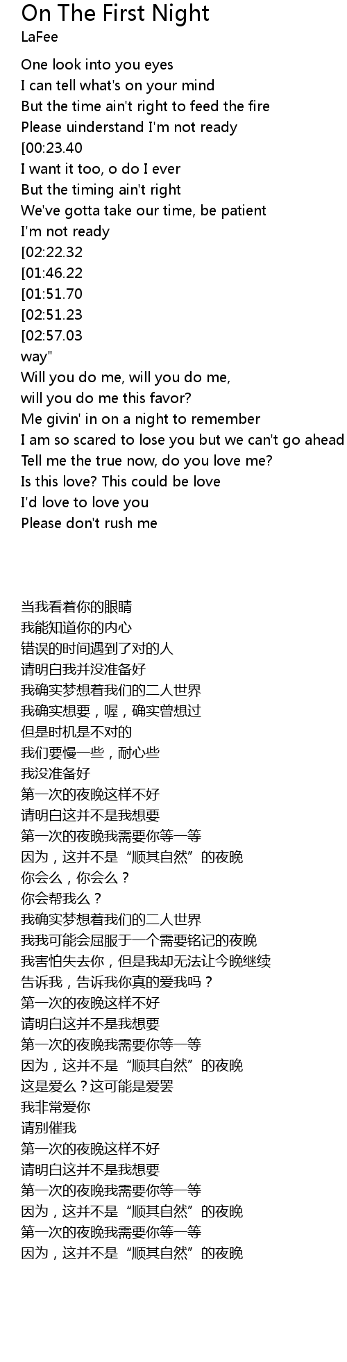 | [03:02.82][02:51.23][01:56.77][00:56.88] | On the first night I need you to wait |
