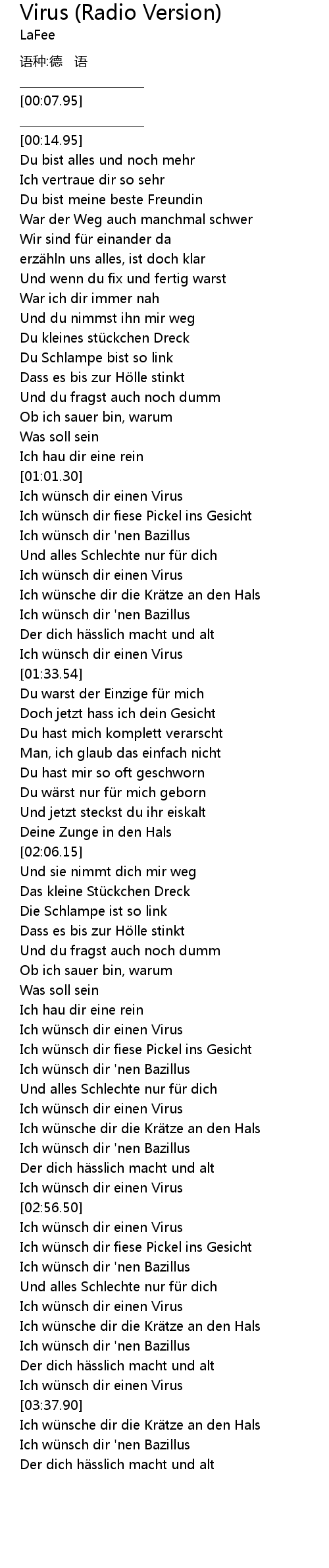 | [02:22.46] | Ich wü nsch dir einen Virus |