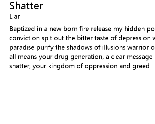 | Baptized in a new born fire release my hidden power unleash my burning conviction spit out the bitter taste of depression warfare against your drug paradise purify the shadows of illusions warrior of justice, ready to fight by all means your drug generation, a clear message control end of my destiny shatter, your kingdom of oppression and greed |