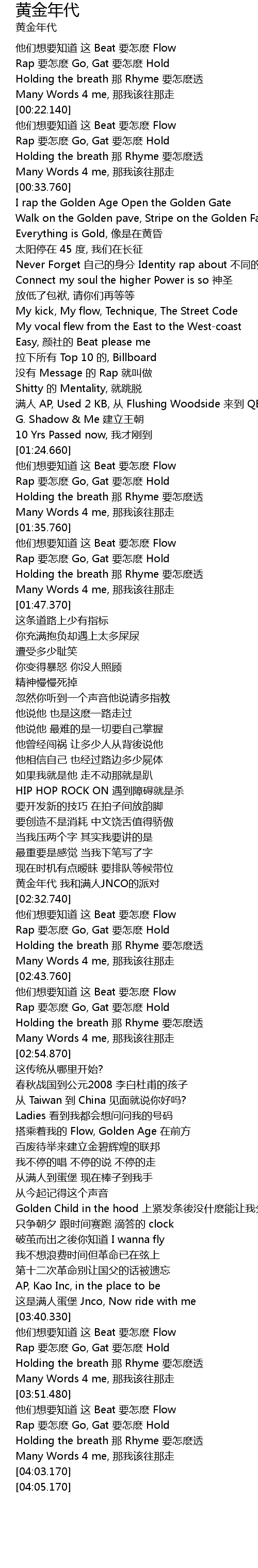| [00:34.310] | I rap the Golden Age Open the Golden Gate |
