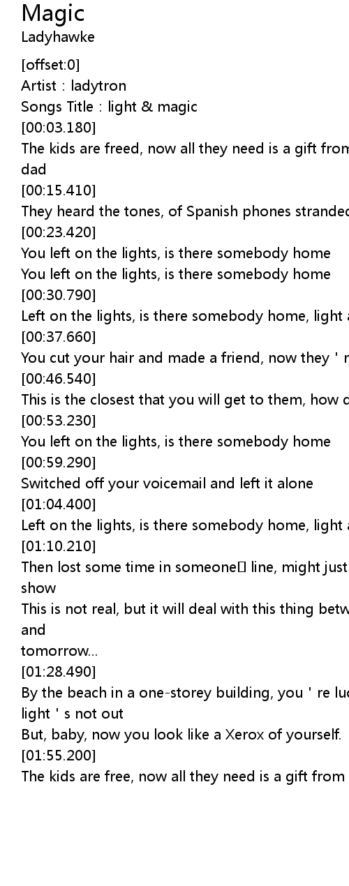 | [01:04.910] | Left on the lights, is there somebody home, light and magic |