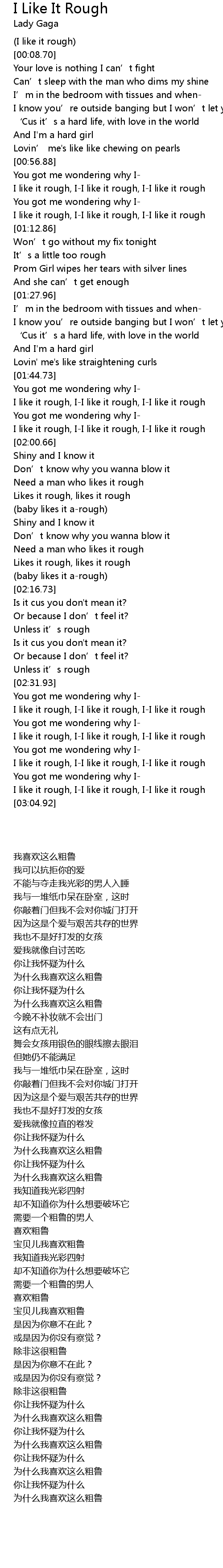 | [02:51.02] | I like it rough, I-I like it rough, I-I like it rough |
