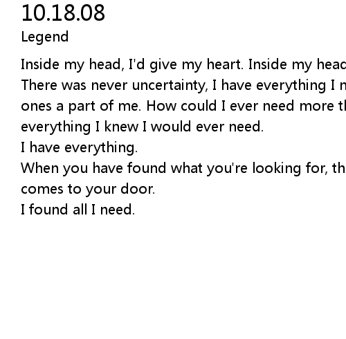 | There was never uncertainty, I have everything I need. I care so much for the ones a part of me. How could I ever need more than what's in front of me? I have everything I knew I would ever need. | |