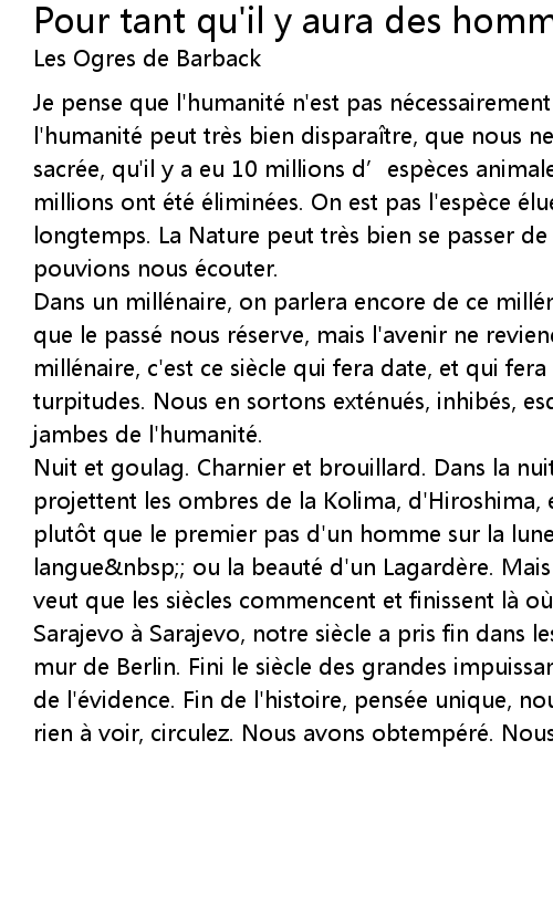 | Dans un mille naire, on parlera encore de ce mille naire. On ne sait jamais ce que le passe nous re serve, mais l' avenir ne reviendra pas. Et dans ce mille naire, c' est ce sie cle qui fera date, et qui fera tache. Un sie cle de turpitudes. Nous en sortons exte nue s, inhibe s, esquinte s. La queue entre les jambes de l' humanite. | |