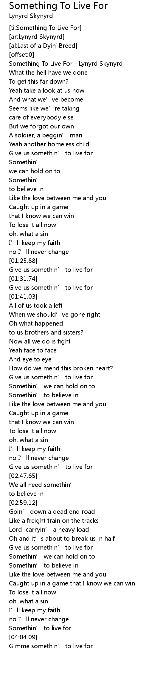 | [00:00.67] | Something To Live For Lynyrd Skynyrd |